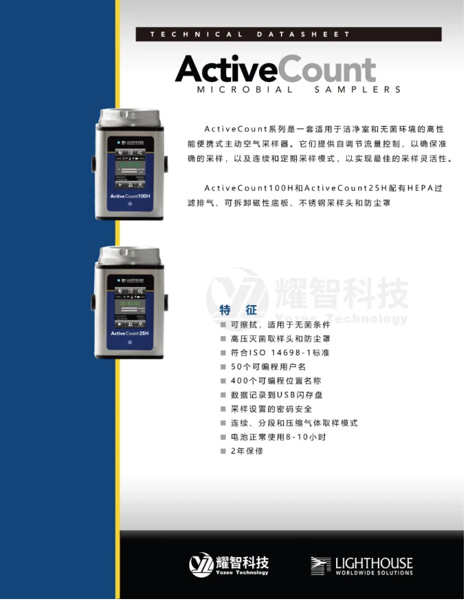 ActiveCount100H和ActiveCount25H配有HEPA過濾排氣、可拆卸磁性底板、不銹鋼采樣頭和防塵罩